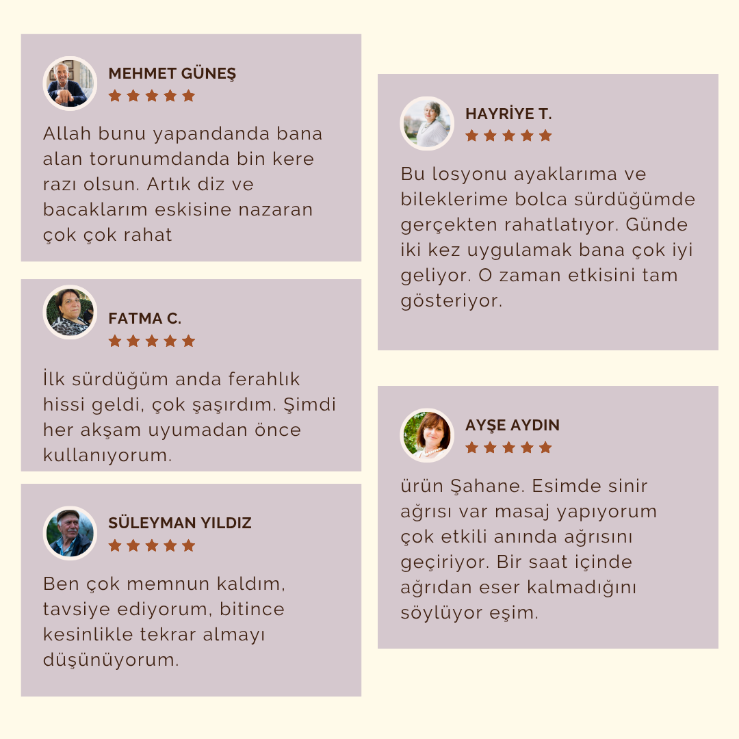 Mucize Ağrı Losyonu, özellikle ayak, bacak ve ellerdeki yanma, karıncalanma ve uyuşma hissini ortadan kaldırmak için geliştirilmiş doğal içerikli bir formüldür. Uçucu yağlar ve magnezyum sayesinde cilde doğrudan nüfuz ederek sinir uçlarını yatıştırır, kasları gevşetir ve gece uykusuzluklarına neden olan ağrılarda hızlı rahatlama sağlar. Düzenli kullanımda, sinir hücrelerini beslemeye yardımcı olur ve gündelik yaşam kalitesini artırır. İlaçsız, zahmetsiz, doğal bir rahatlama arayanlar için ideal bir çözümdür.